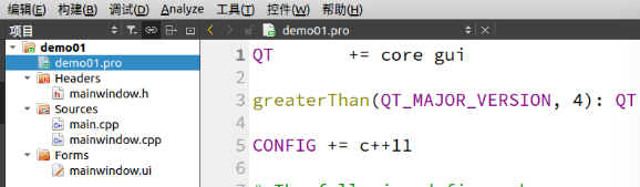 在demo01.pro中,core(核心模块) gui(图形界面模块)为QT的模块