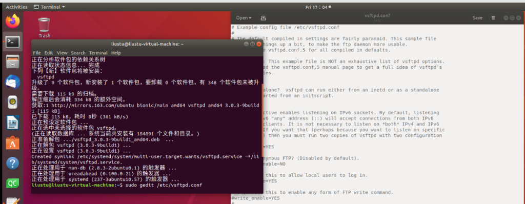 等待软件安装完成后,使用vi或者gedit命令打开/etc/vsftpd.conf