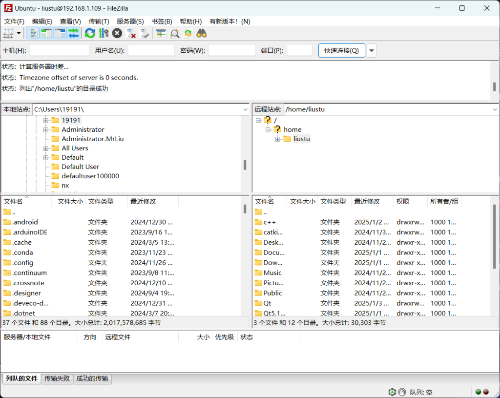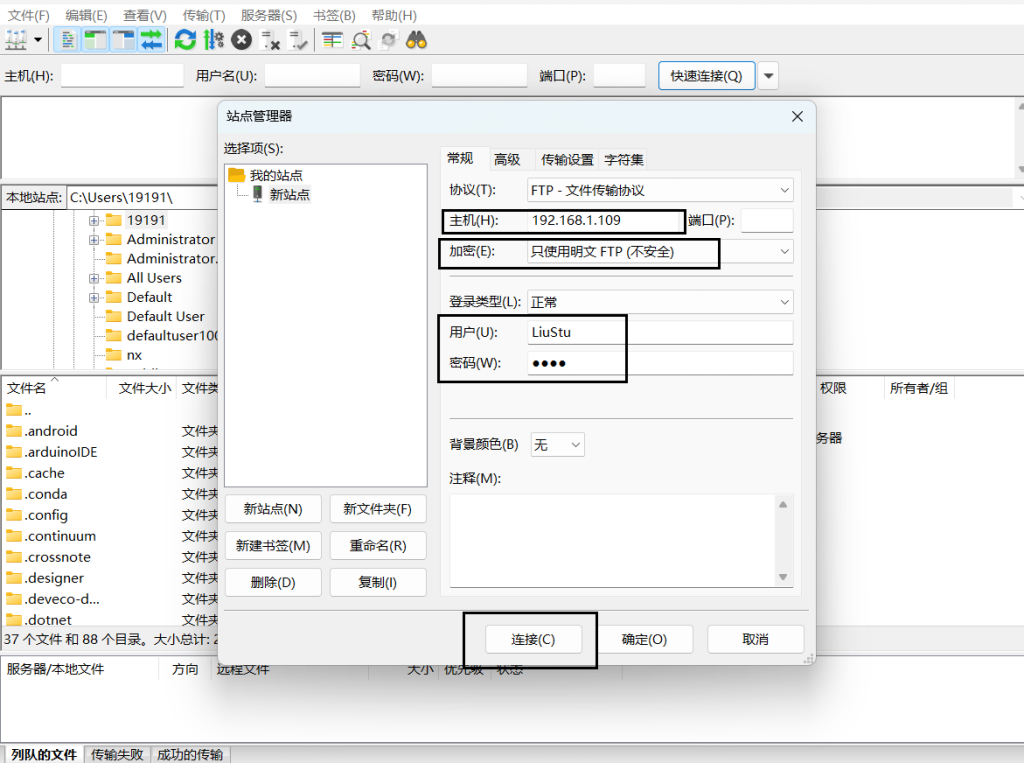 我这里的主机ip为192.168.1.109;端口号不需要填写;加密选择只使用明文FTP;用户和密码为Ubuntu登入的账号密码。