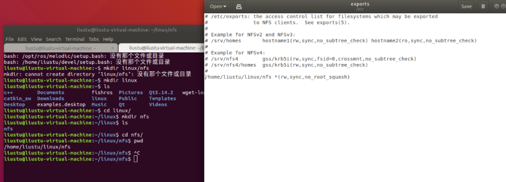 /home/liustu/linux/nfs *(rw,sync,no_root_squash),此处的/home/liustu/linux/nfs为你创建的目录,你可使用pwd查看。