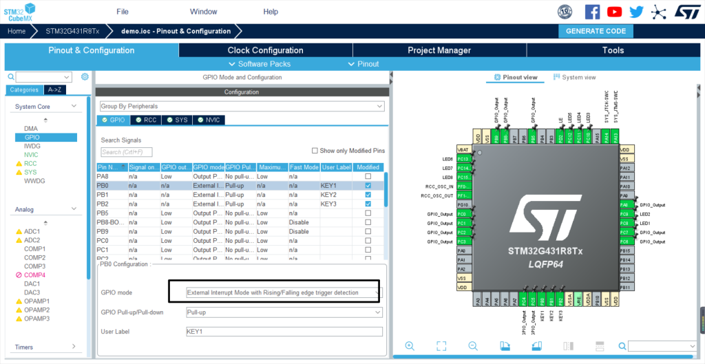 将按键引脚设置为双边沿中断触发模式,并设置上拉电阻。