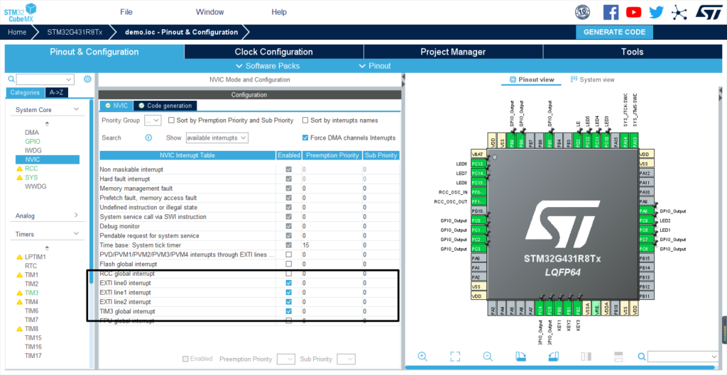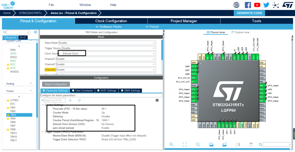 定时器本次选择TIM3,选择内部时钟源,设置PSC为80-1,COUNTER Period为1000-1,实现1ms定时(频率为80MHz)