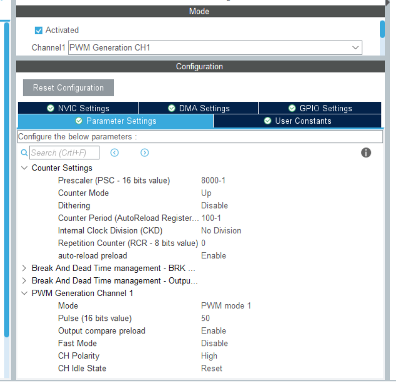 以获取一个100Hz,占空比为50的脉冲信号,现在设置时钟频率为80MHz,参数设置中PSC,ARR需要我们自己配置(当然我们后期实现代码修改频率、占空比的时候会修改这些数据)。
