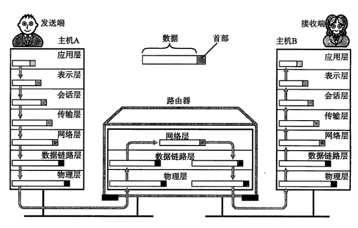 发送方由顶层开始由上到下,按照顺序每一层进行传输;每个分层在处理上层发送的数据时,都会加上当前层协议所需的“头部”信息(协议ID,报文头)。接收方自下层往上接收,每个分层都会对接受的数据进行该层协议的头部信息与原内容进行“分离”。最终将发送的数据恢复为原始数据。
