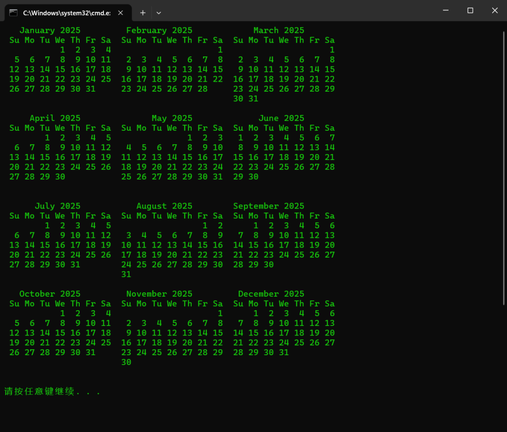 在main函数中调用show_year函数,参数为所要查询的月份,即可在终端显示。