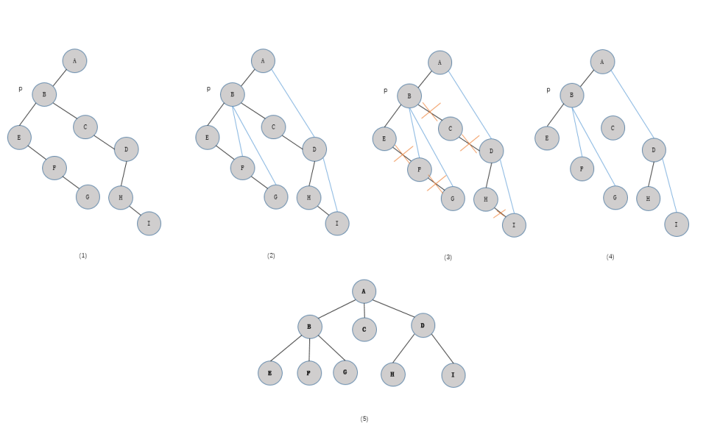 抹线:对每个结点,除了其第一个孩子外,除去其与其余孩子之间的连线