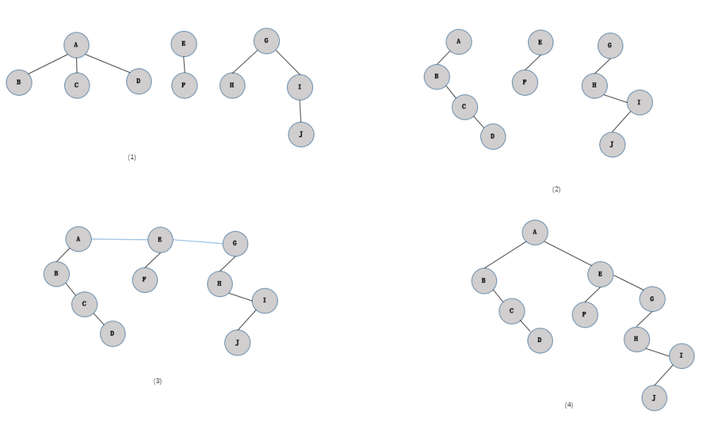 将每棵树的根结点用线相连,以第一棵树根结点为二叉树的根