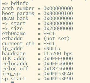 bdinfo可以查到板子信息:DRAM(动态随机存储器)的起始地址和大小、启动参数保存起始地址、波特率、sp(堆指针)起始地址等信息