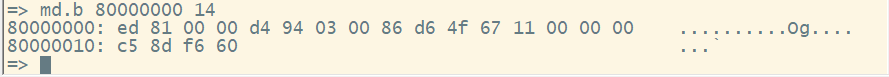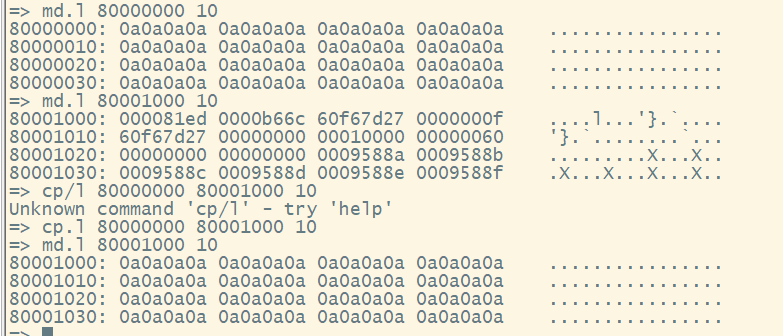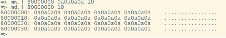 md命令用于显示内存值:md [.b,.w,.l] address [# of objects]