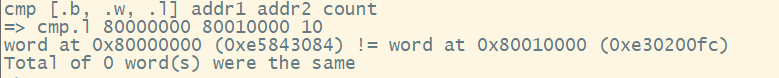 命令中 .b,.w,.l 对应的是byte、word、long对应1、2、4字节来显示内存;address显示的是内存值,其为查看的起始地址;[# of objects]表示查看的数据长度,数据长度应为16进制**(Ubbot命令中的数字都是16进制)**