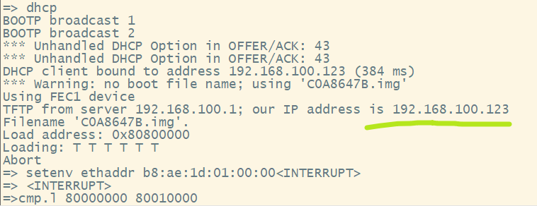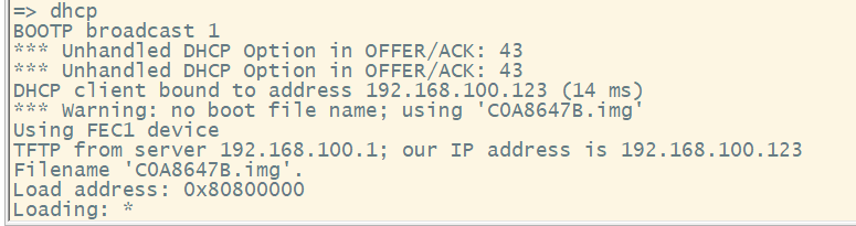 在输出有有一段“warning……”、“TFTP……”的内容,这是因为dhcp不单单是获取ip地址,其还会通过tftp来启动linux内核