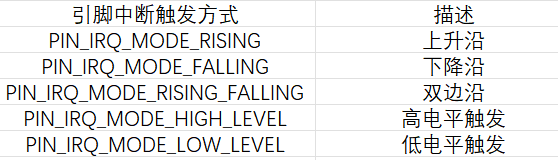 引脚的中断触发方式一共5种:下降沿、上升沿、高电平、低电平、双边沿