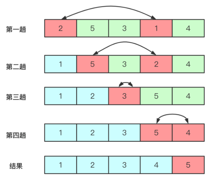 通过遍历数组,选出该数组中较大或者较小的,放在数组的起始位置,当遍历完整个数组时排序完成