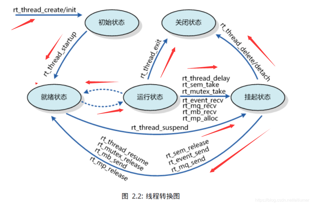 线程分为5个状态:初始状态(RT_THREAD_INIT)、就绪状态(RT_THREAD_READY)、运行状态(RT_THREAD_RUNNING)、挂起状态(RT_THREAD_SUSPEND)、关闭状态(RT_THREAD_CLOSE)