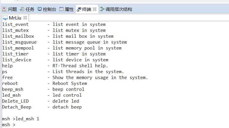 导出msh命令到列表中(终端列表):MSH_CMD_EXPORT(command, desc),command代表函数的名字,desc代表描述命令用法的字符串(类似help)