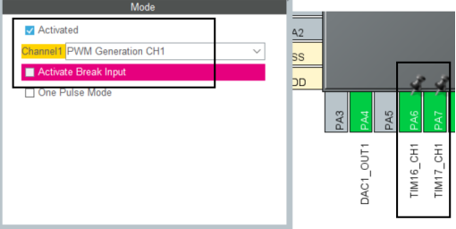 PA6、PA7分别对应着TIM16CH1、TIM17CH1