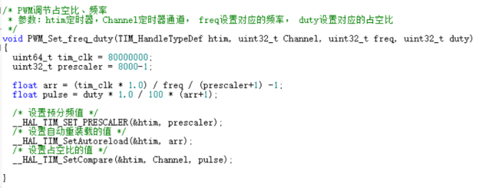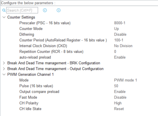 设置PSC为8000-1,ARR为100-1,使能自动重装载,设置占空比Pulse为50,后期可以使用函数修改