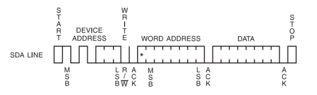 发送一个起始信号->发送设备写地址->等待ACK->发送要写入的数据地址->等待ACK->发送8位的数据->等待ACK->发送停止信号