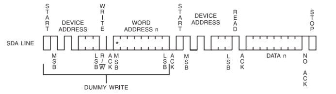 发送起始信号->发送设备的写地址->等待ACK->发送要读的数据地址->发送ACK->(发送停止信号->发送起始信号->)发送设备的读地址->等到ACK->读取数据->发送ACK应答->发送停止信号
