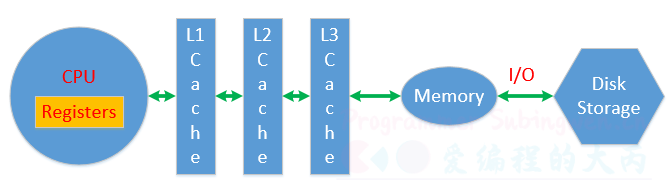 CPU对应寄存器、一级缓存、二级缓存、三级缓存都是独占的,用于存储处理的数据和线程的状态信息,数据被CPU处理完成需要再次被写入的物理内存中,物理内存数据也可以通过文件IO操作写入到磁盘中。