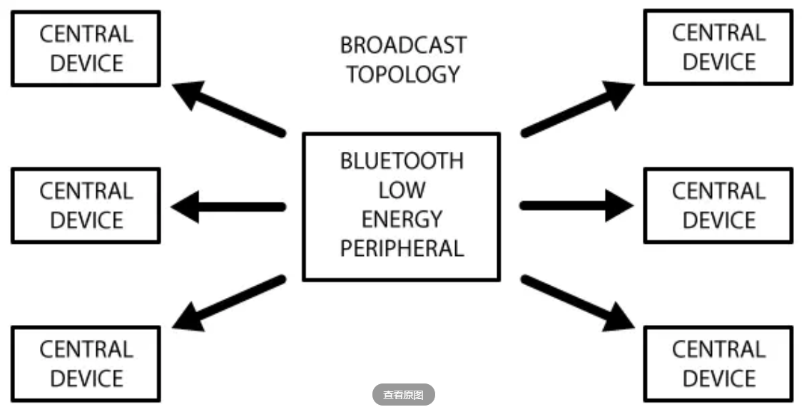 大部分情况下,外设通过广播来让中心设备发现自己,并GATT连接,从而进行更多的数据交换。 也有些情况是不需要连接的,只要外设广播自己的数据即可。用这种方式主要目的是让外围设备,把自己的信息发送给多个中心设备。因为基于GATT连接的方式的,只能是一个外围设备连接一个中心设备。 广播模式的网络拓扑图如下: