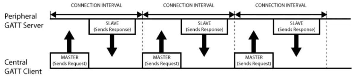 所有的通知时间,都是由客户端发起,并且接收服务端的响应 一旦建立连接,外设将会给中心设备一个连接间隔,这样中心设备i就会在每个连接间隔尝试去连接,检查是否有新的数据。但是,这个连接间隔只是一个建议,中心设备可能不会严格按照设定的间隔执行。 下图为外设(GATT服务端)与中心设备(GATT客户端)之间的数据交流流程,可以看到的时,每次都是中心设备发起请求: