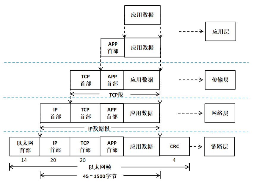 当用户通过应用程序发送数据时,数据会逐层向下传递,每经过一层,该层协议会在数据头部添加对应的“协议首部”,完成“封装”: