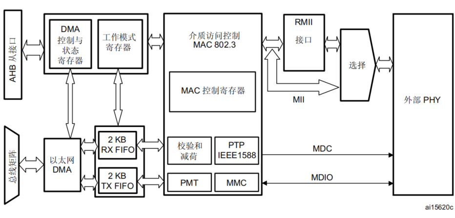- RMII与MII是MAC 内核与PHY芯片的数据交互通道,用来传输以太网数据。