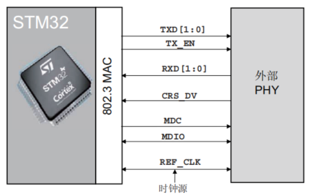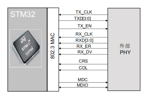 - MDC和MDIO是MAC内核对PHY芯片的管理和配置,是站管理接口(SMI)所需的通信引脚。